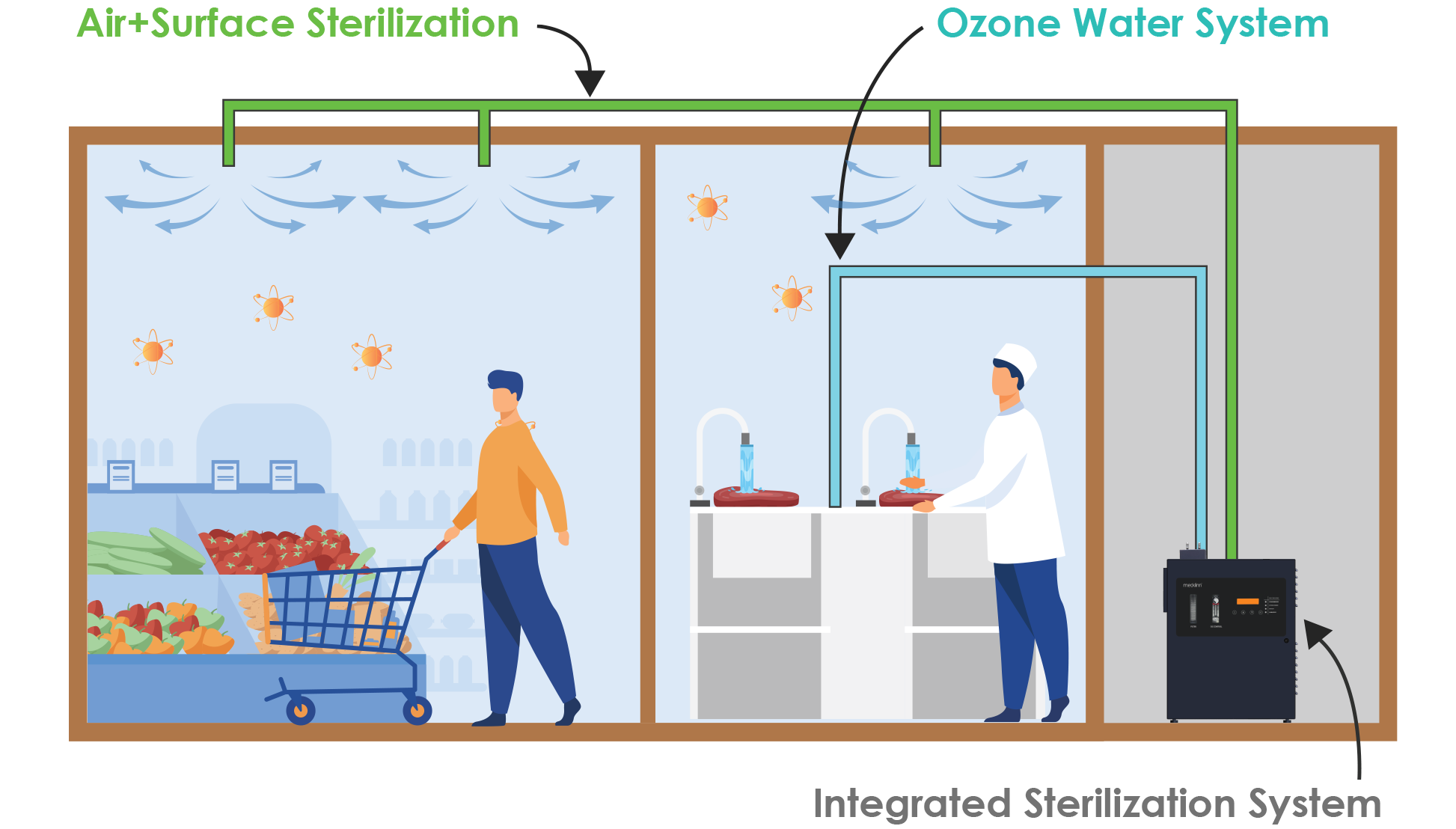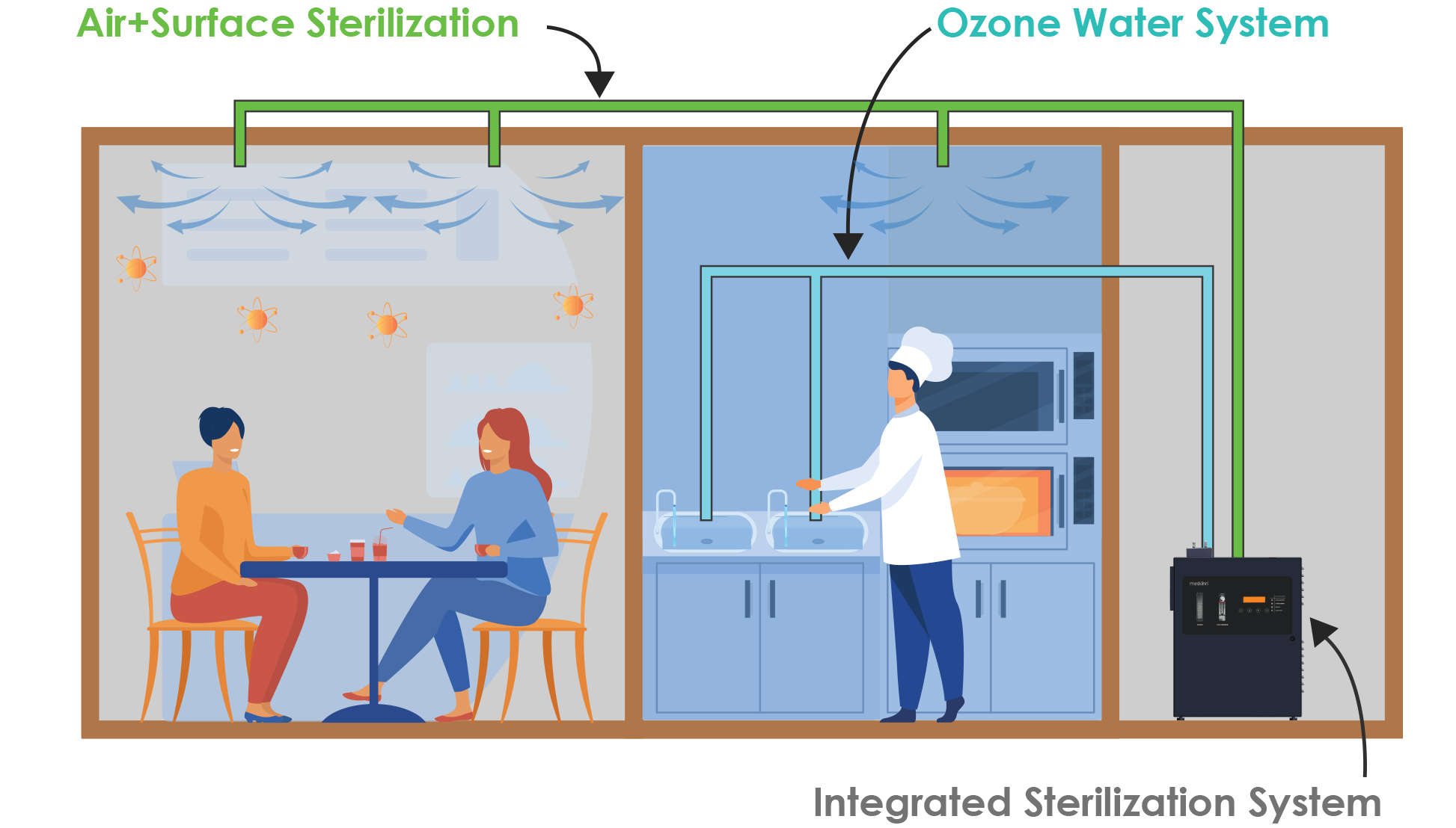 In the kitchen, Medklinn Ozone Water is channeled into all incoming water supply outlets – enabling effective general cleaning of counters, floors and drains without hot water, as well as the sanitizing and sterilizing fresh produce, seafood, poultry and meat.