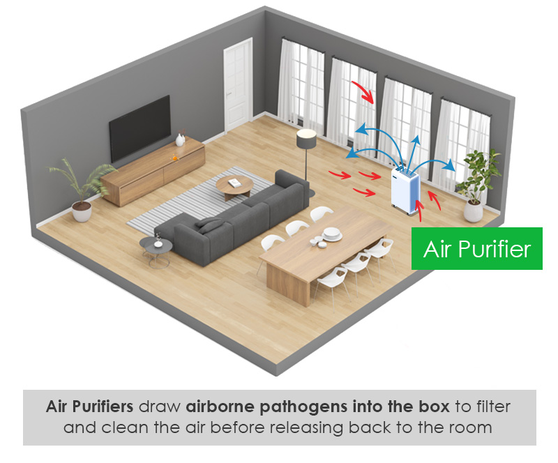Filtration or Entrapment of the virus (through recirculating air) is achieved via filters installed in the air conditioning equipment, or with portable air purifiers.